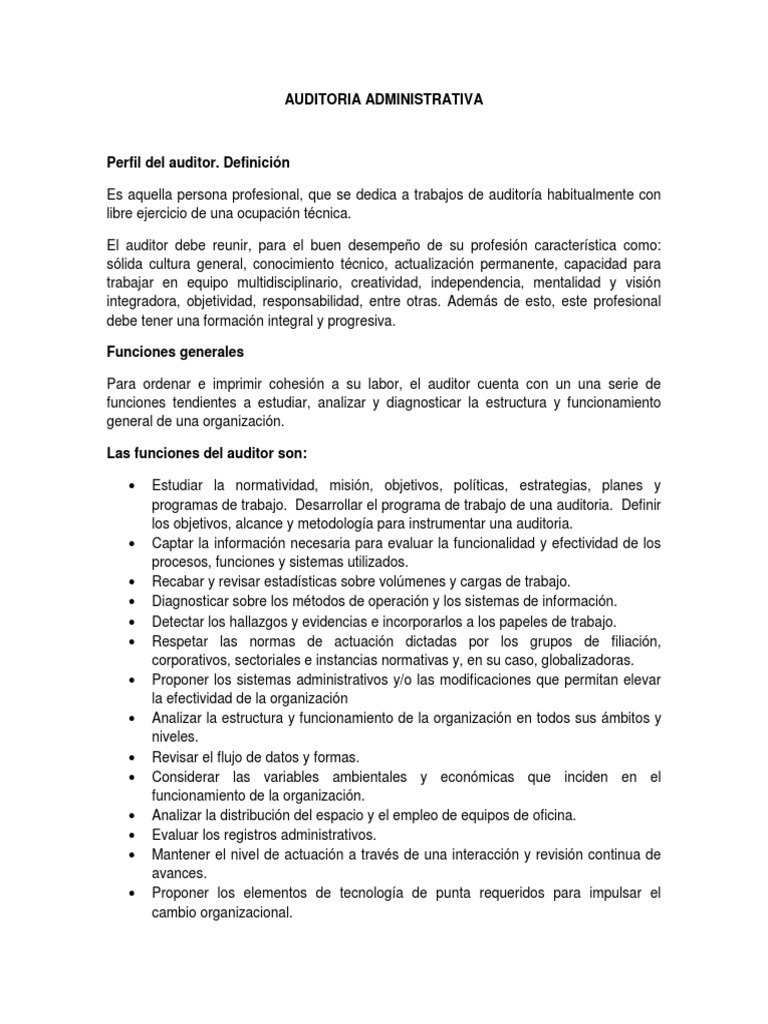 Perfil de un auditor administrativo. EL PERFIL DEL AUDITOR. Slida cultura general conocimiento tcnico actualizacin permanente capacidad para trabajar en equipo. Las características de un auditor constituyen uno de los temas de importancia en el proceso de realizar una auditoria administrativa dentro de una empresa ya que en el recae la.