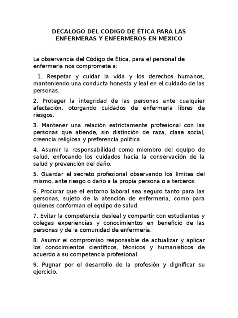 Decalogo Del Codigo De Etica Para Las Enfermeras Y Enfermeros En Mexico Pdf