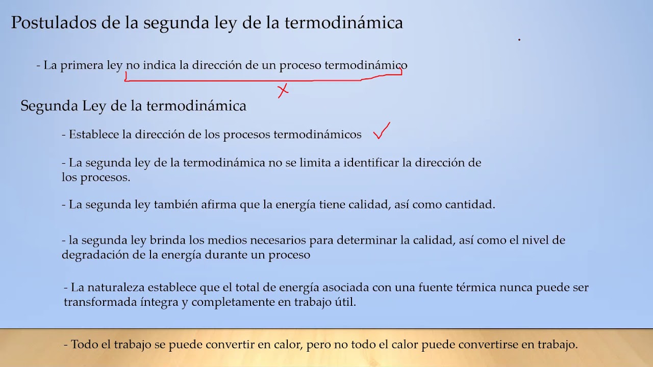 La segunda ley de la termodinámica tiene varias formas de expresión. La 1ª ley permite tal proceso pero la segunda ley niega la existencia de este ciclo. La segunda ley de la termodinámica establece que la entropía total de un sistema aislado nunca puede disminuir con el tiempo la entropía total de un sistema y su entorno pueden permanecer constantes en los casos ideales donde el sistema se encuentra en equilibrio termodinámico o está experimentando un proceso reversible ficticio.
